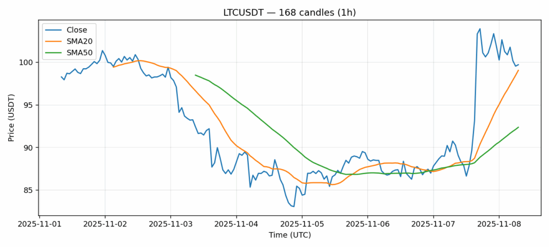 Litecoin — 1h candles, 7D window (SMA20/SMA50, RSI).