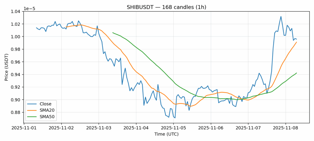 Shiba Inu — 1h candles, 7D window (SMA20/SMA50, RSI).