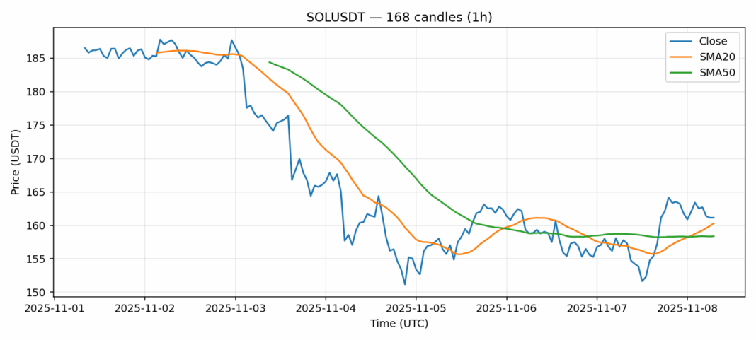 Solana — 1h candles, 7D window (SMA20/SMA50, RSI).