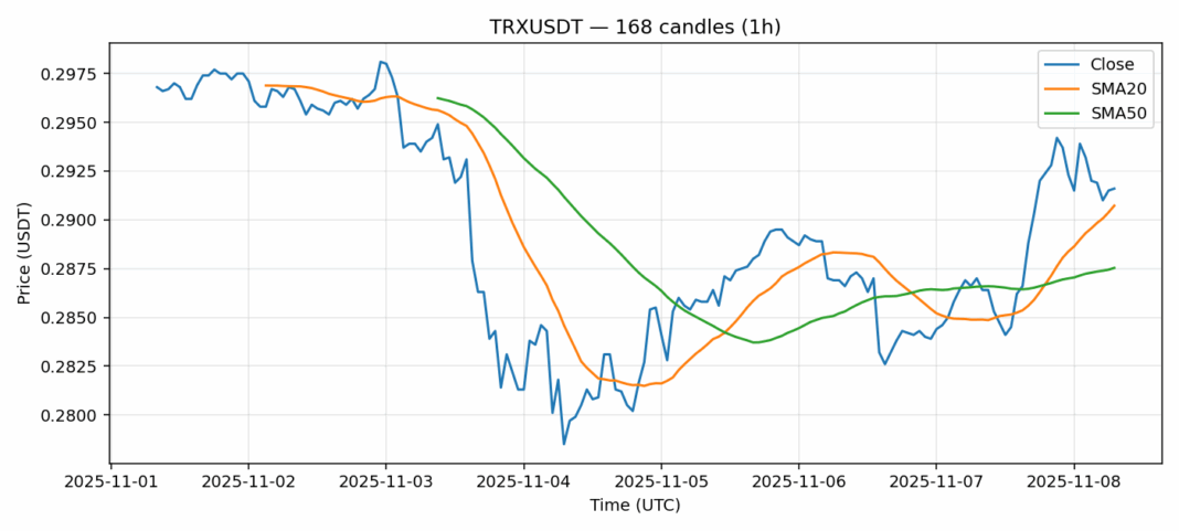 TRON — 1h candles, 7D window (SMA20/SMA50, RSI).