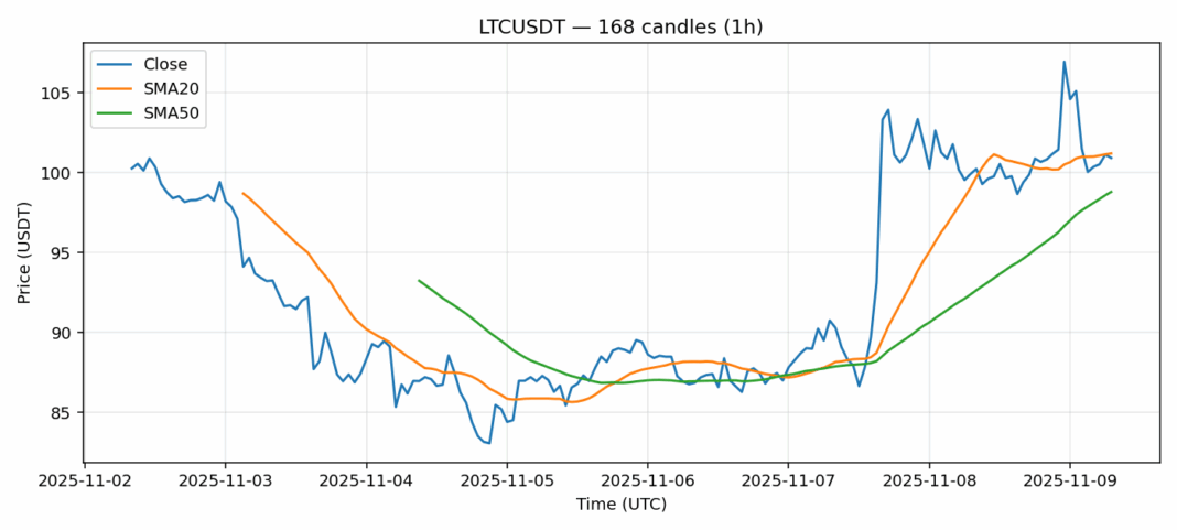 Litecoin — 1h candles, 7D window (SMA20/SMA50, RSI).