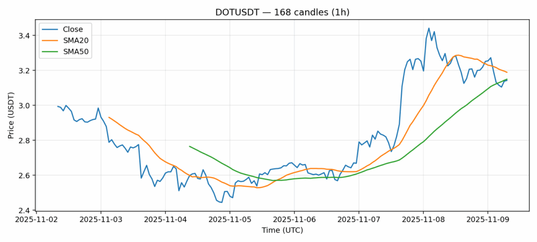 Polkadot — 1h candles, 7D window (SMA20/SMA50, RSI).