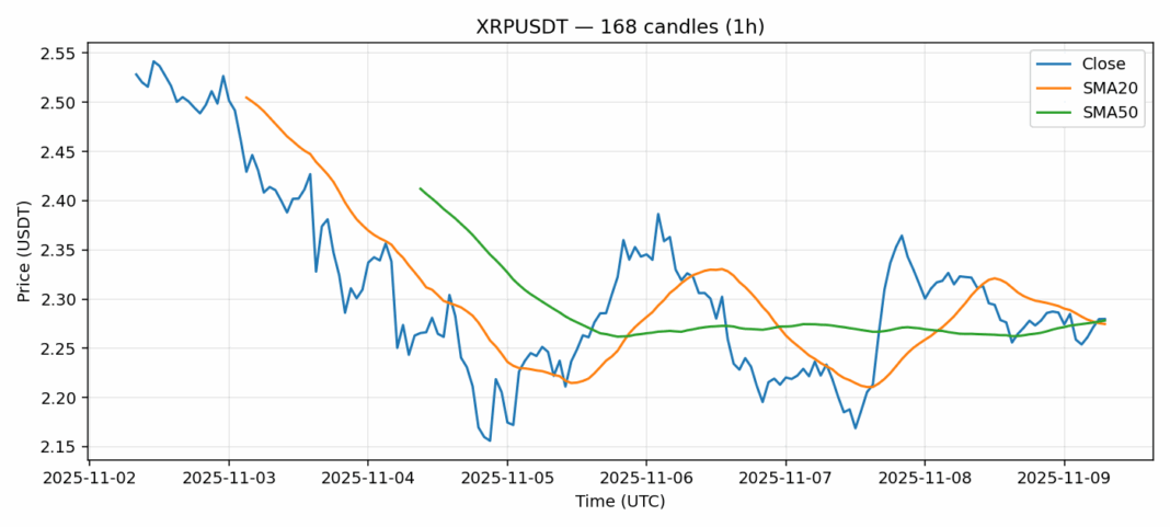 Ripple — 1h candles, 7D window (SMA20/SMA50, RSI).
