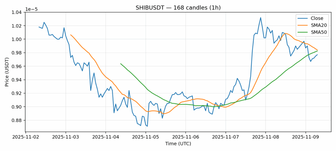 Shiba Inu — 1h candles, 7D window (SMA20/SMA50, RSI).