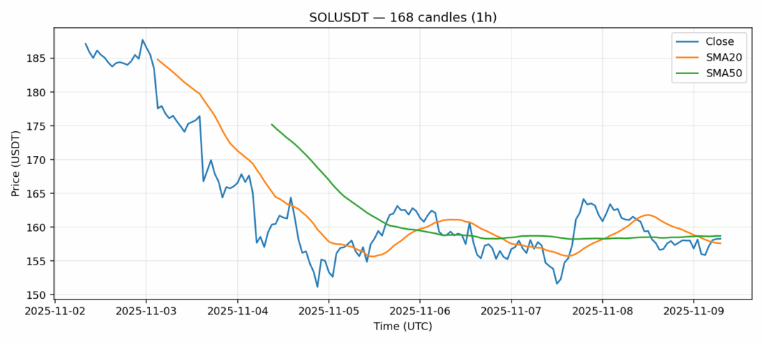 Solana — 1h candles, 7D window (SMA20/SMA50, RSI).