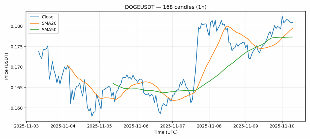 Dogecoin — 1h candles, 7D window (SMA20/SMA50, RSI).