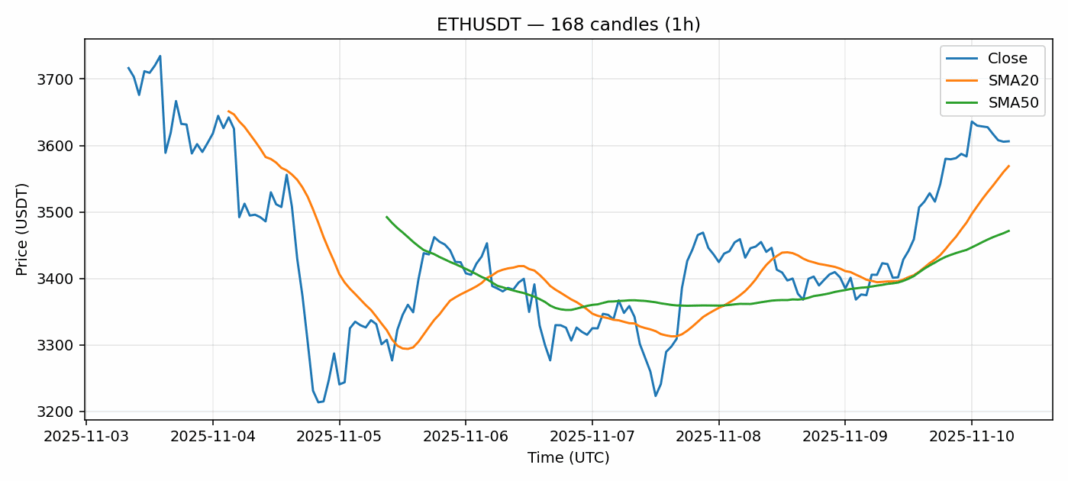 Ethereum — 1h candles, 7D window (SMA20/SMA50, RSI).