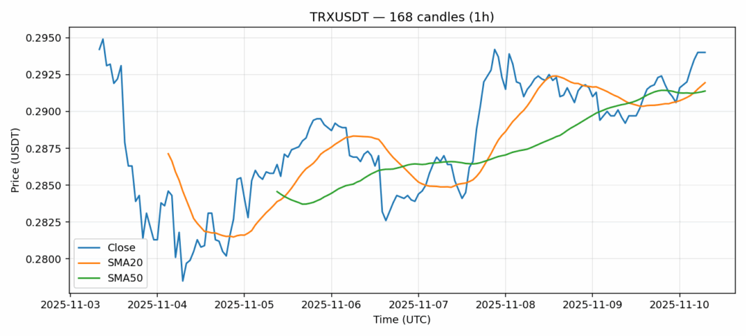 TRON — 1h candles, 7D window (SMA20/SMA50, RSI).