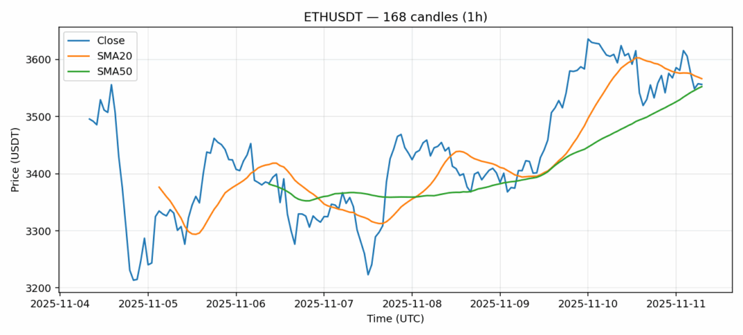 Ethereum — 1h candles, 7D window (SMA20/SMA50, RSI).