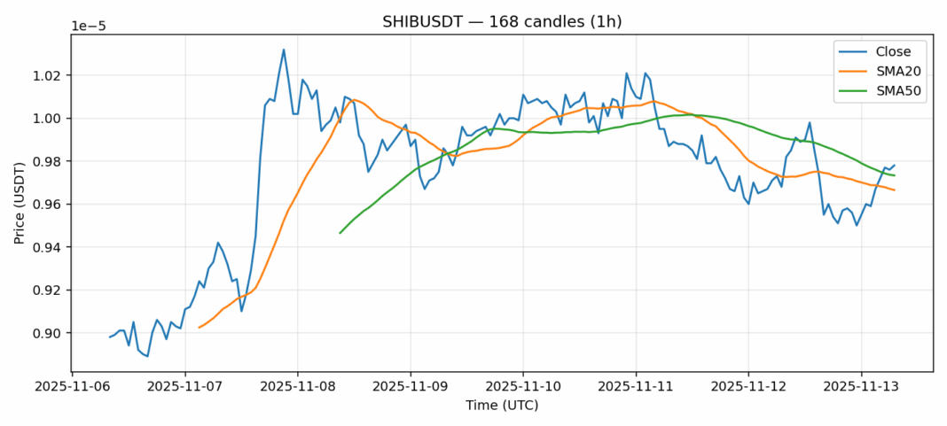 Shiba Inu — 1h candles, 7D window (SMA20/SMA50, RSI).