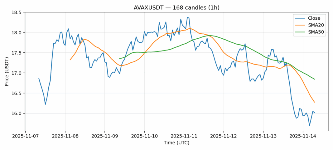 AVAX is showing significant weakness in today’s trading, down over 9% against USDT to $16.02 as selling pressure intensifies. The current price has broken below both the 20-day SMA ($16.28) and 50-day SMA ($16.84), indicating bearish momentum in the short to medium term. With RSI sitting at 39.29, AVAX is approaching oversold territory but hasn’t reached extreme levels yet. The elevated volatility of 4.59% suggests continued price swings are likely. Trading volume remains substantial at $65 million, confirming genuine selling interest rather than thin market conditions. For traders, this breakdown below key moving averages suggests caution is warranted. Consider waiting for RSI to dip below 30 for potential oversold bounce opportunities, or look for consolidation above $15.50 before considering long positions. Resistance now sits at the $16.28-16.84 SMA cluster, while sustained breaks below $15.50 could trigger further declines toward $14 support.
