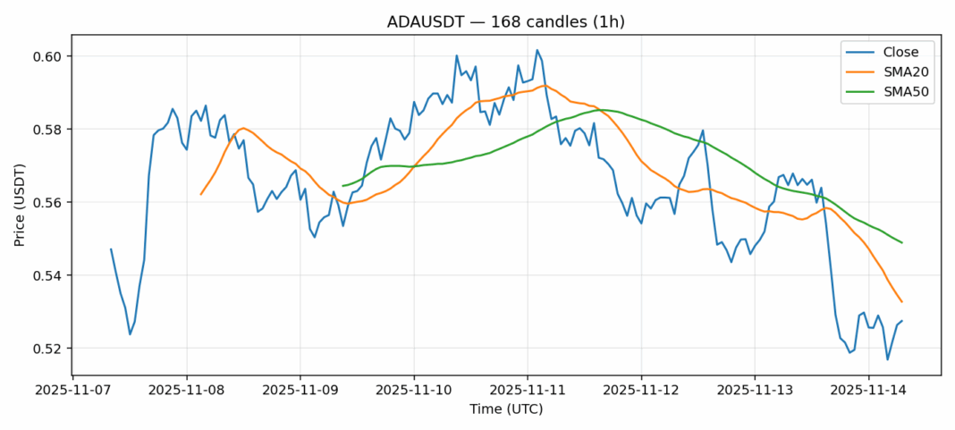 Cardano — 1h candles, 7D window (SMA20/SMA50, RSI).