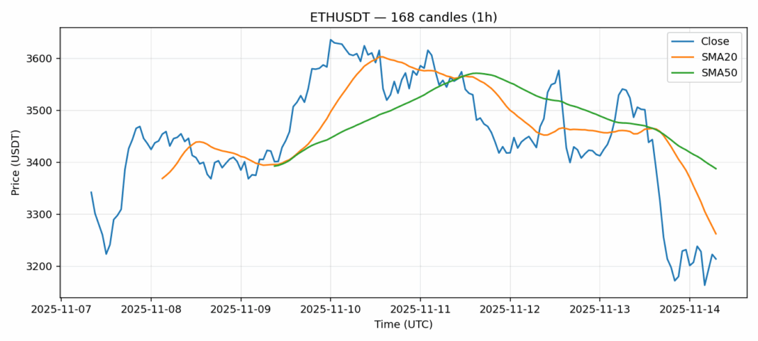 Ethereum — 1h candles, 7D window (SMA20/SMA50, RSI).