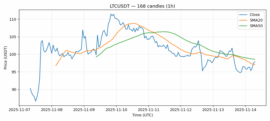 Litecoin — 1h candles, 7D window (SMA20/SMA50, RSI).