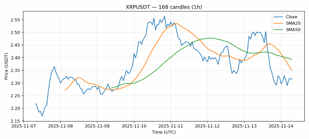Ripple — 1h candles, 7D window (SMA20/SMA50, RSI).