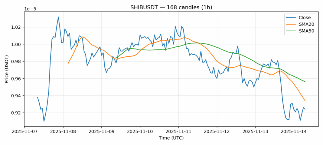 Shiba Inu — 1h candles, 7D window (SMA20/SMA50, RSI).