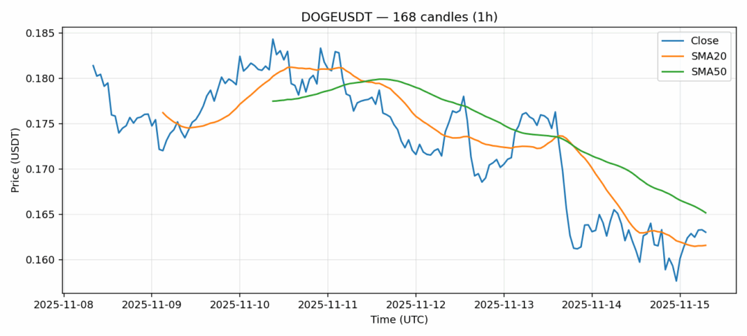 Dogecoin — 1h candles, 7D window (SMA20/SMA50, RSI).