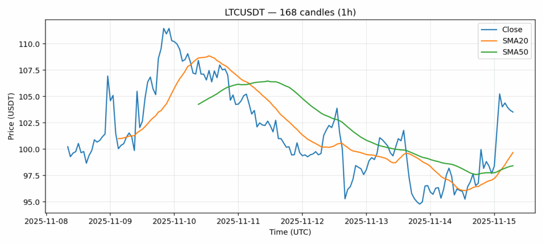 Litecoin — 1h candles, 7D window (SMA20/SMA50, RSI).