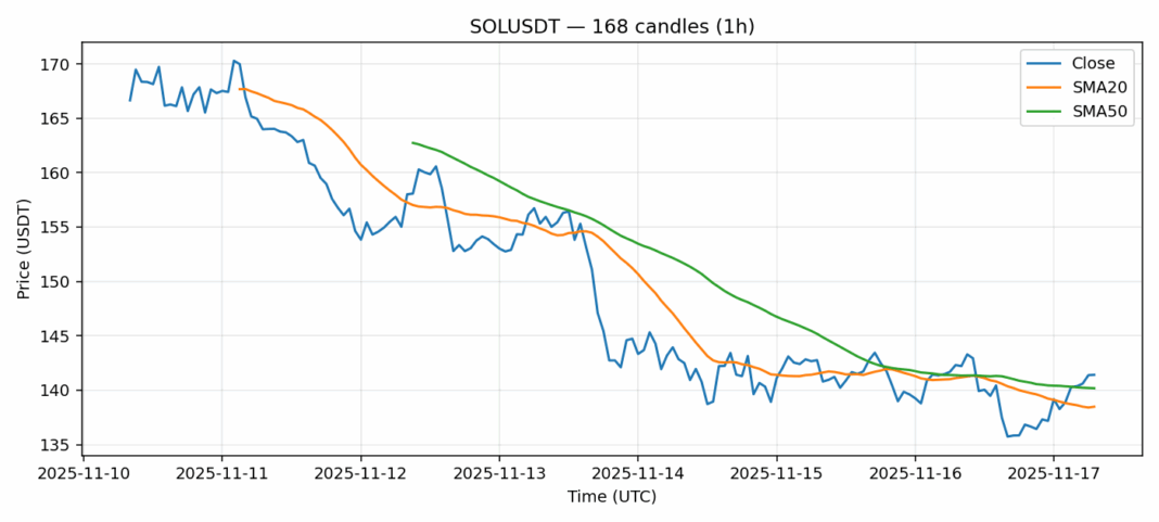 Solana — 1h candles, 7D window (SMA20/SMA50, RSI).