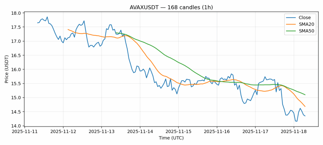 AVAX is showing significant technical weakness as it trades at $14.35, down 8.77% over the past 24 hours. The current price sits below both the 20-day SMA ($14.69) and 50-day SMA ($15.10), indicating sustained bearish momentum. However, the RSI reading of 37.72 suggests AVAX is approaching oversold territory, which could present a potential buying opportunity for contrarian traders. The elevated volatility of 4.85% reflects heightened market uncertainty, while substantial 24-hour volume of $71.7 million confirms active institutional participation. For short-term traders, consider waiting for RSI to drop below 30 for optimal entry points. Medium-term investors might scale into positions between $13.50-$14.00, targeting a retest of the 20-day SMA resistance. Always use strict stop-losses given the current bearish structure, with key support levels around $13.20 and resistance at $15.10.