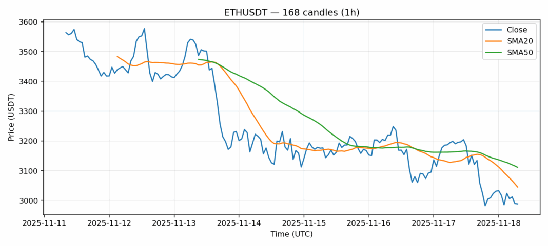 Ethereum — 1h candles, 7D window (SMA20/SMA50, RSI).