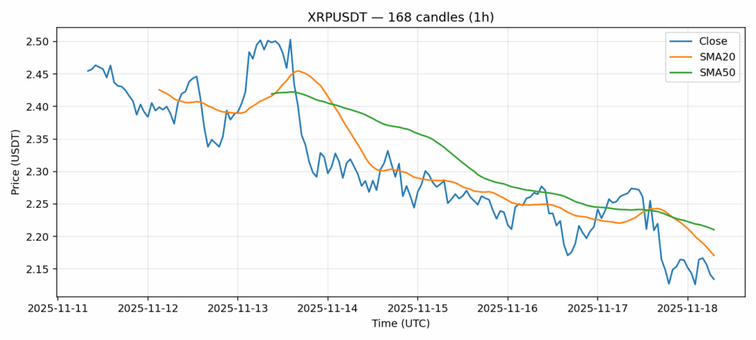 XRP is showing signs of consolidation after a sharp 5.65% decline over the past 24 hours, currently trading at $2.13. The RSI reading of 41.79 indicates the asset is approaching oversold territory, though it hasn’t yet reached the traditional 30-level threshold that typically signals a buying opportunity. Technical positioning shows XRP trading below both its 20-day SMA ($2.17) and 50-day SMA ($2.21), suggesting near-term bearish momentum remains intact. However, the substantial 24-hour trading volume exceeding $532 million indicates significant institutional interest at these levels. Traders should watch for a decisive break above the $2.17 resistance level for potential long entries, while maintaining stop-losses below $2.10. The current volatility of 4.17% presents both risk and opportunity – position sizing should reflect the elevated uncertainty. Given the oversold RSI conditions and strong volume support, we may see a technical bounce toward the $2.20-$2.25 resistance zone in coming sessions.
