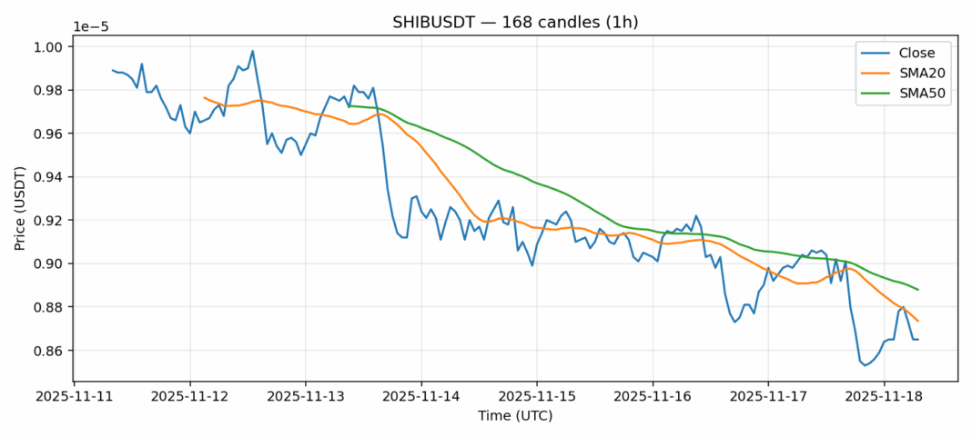 Shiba Inu — 1h candles, 7D window (SMA20/SMA50, RSI).