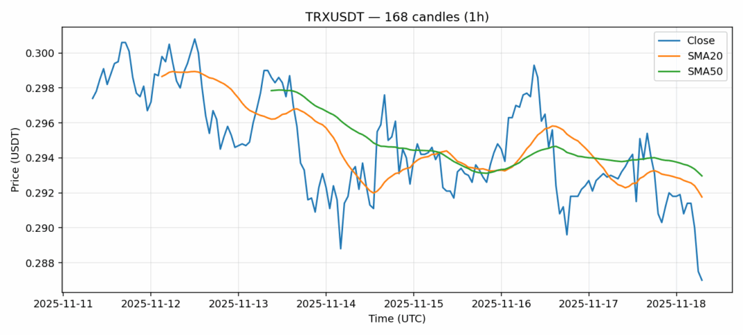 TRON — 1h candles, 7D window (SMA20/SMA50, RSI).