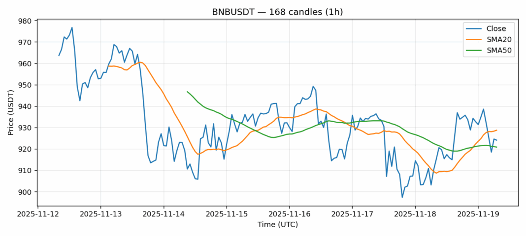 BNB — 1h candles, 7D window (SMA20/SMA50, RSI).
