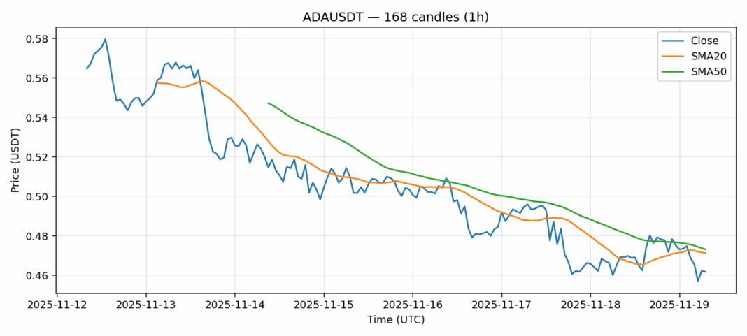 Cardano — 1h candles, 7D window (SMA20/SMA50, RSI).