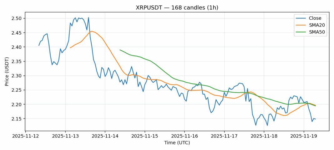 Ripple — 1h candles, 7D window (SMA20/SMA50, RSI).