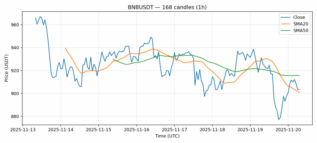 BNB — 1h candles, 7D window (SMA20/SMA50, RSI).