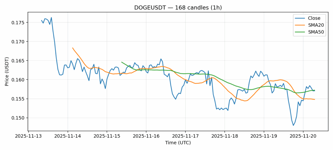 Dogecoin — 1h candles, 7D window (SMA20/SMA50, RSI).