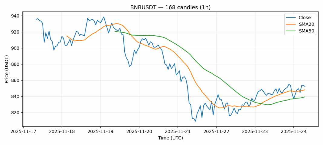 BNB — 1h candles, 7D window (SMA20/SMA50, RSI).