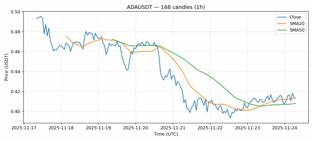Cardano — 1h candles, 7D window (SMA20/SMA50, RSI).