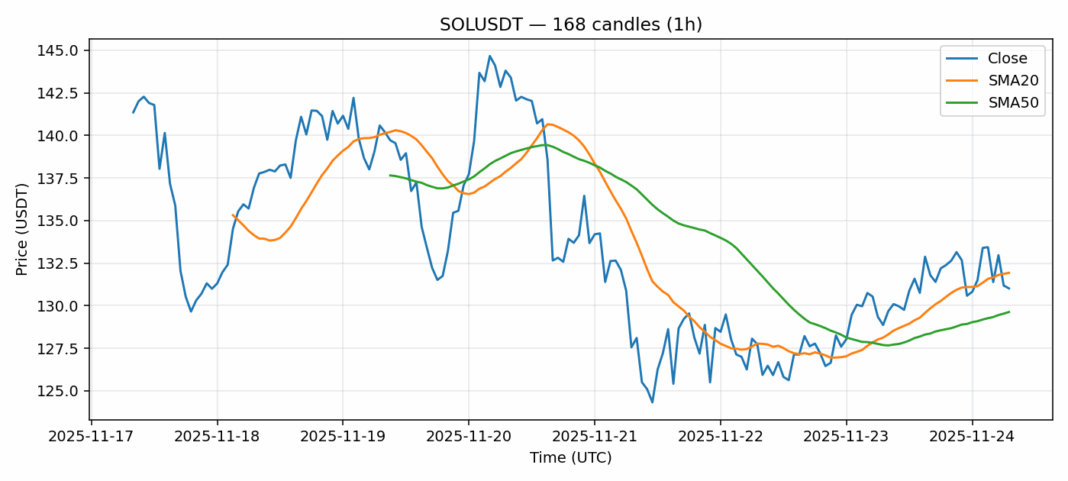 Solana — 1h candles, 7D window (SMA20/SMA50, RSI).