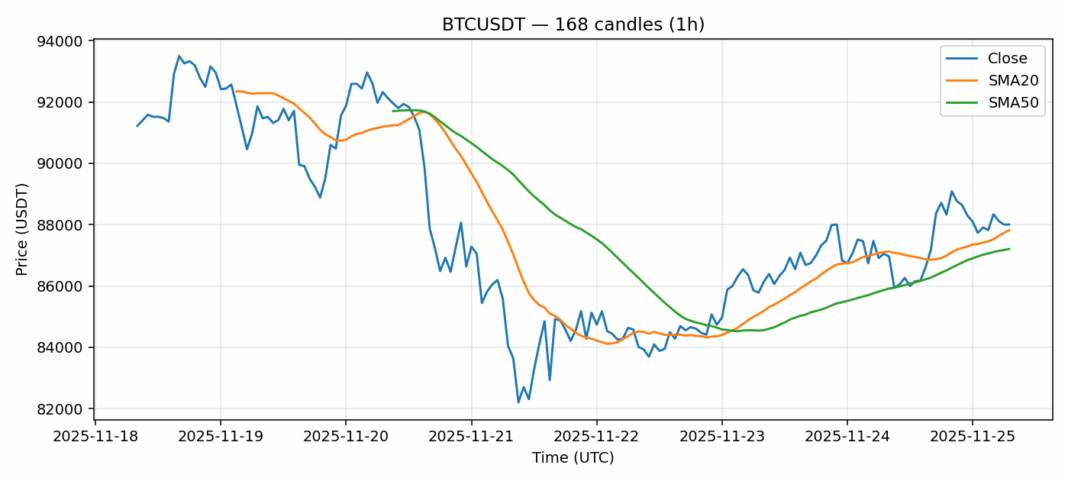 Bitcoin — 1h candles, 7D window (SMA20/SMA50, RSI).