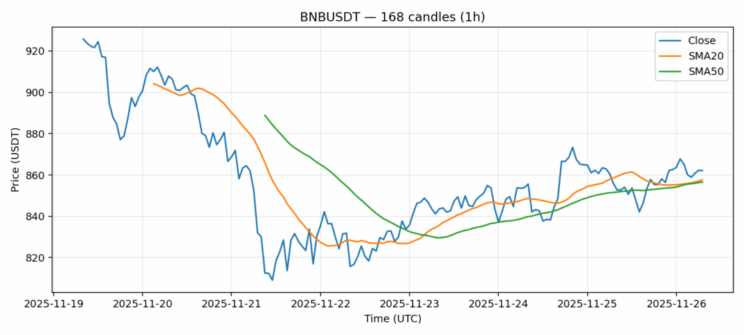 BNB — 1h candles, 7D window (SMA20/SMA50, RSI).