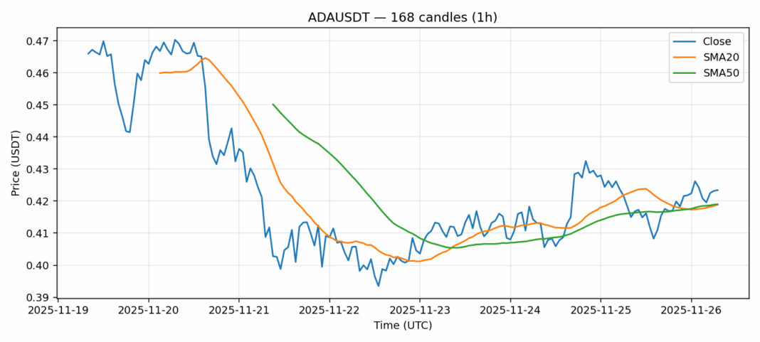 Cardano — 1h candles, 7D window (SMA20/SMA50, RSI).