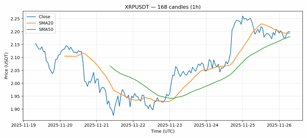 Ripple — 1h candles, 7D window (SMA20/SMA50, RSI).