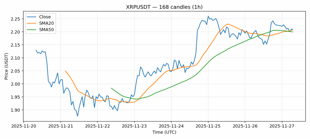 Ripple — 1h candles, 7D window (SMA20/SMA50, RSI).