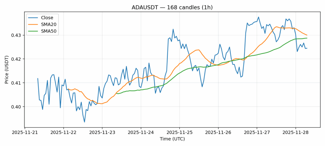 Cardano — 1h candles, 7D window (SMA20/SMA50, RSI).
