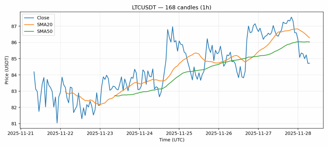 Litecoin — 1h candles, 7D window (SMA20/SMA50, RSI).