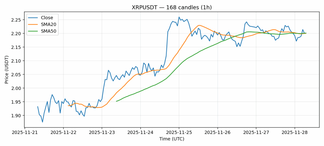Ripple — 1h candles, 7D window (SMA20/SMA50, RSI).