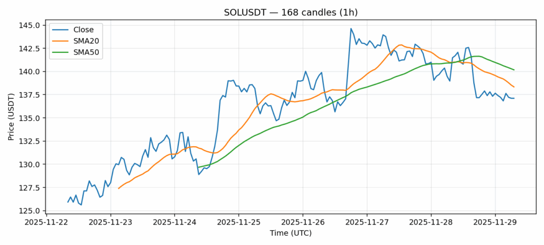 Solana — 1h candles, 7D window (SMA20/SMA50, RSI).