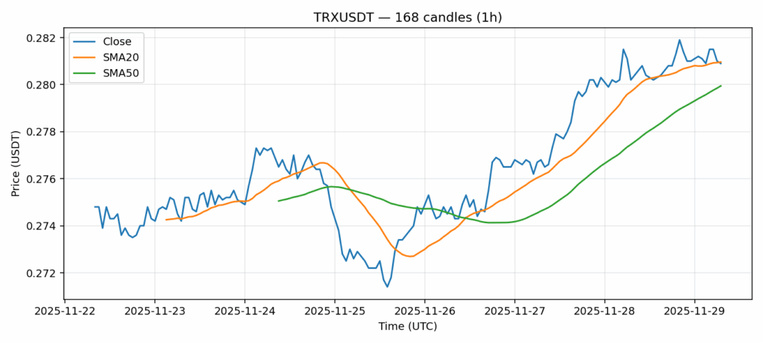 TRON — 1h candles, 7D window (SMA20/SMA50, RSI).