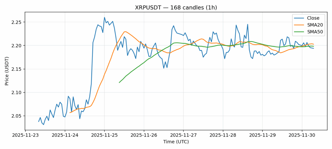 Ripple — 1h candles, 7D window (SMA20/SMA50, RSI).