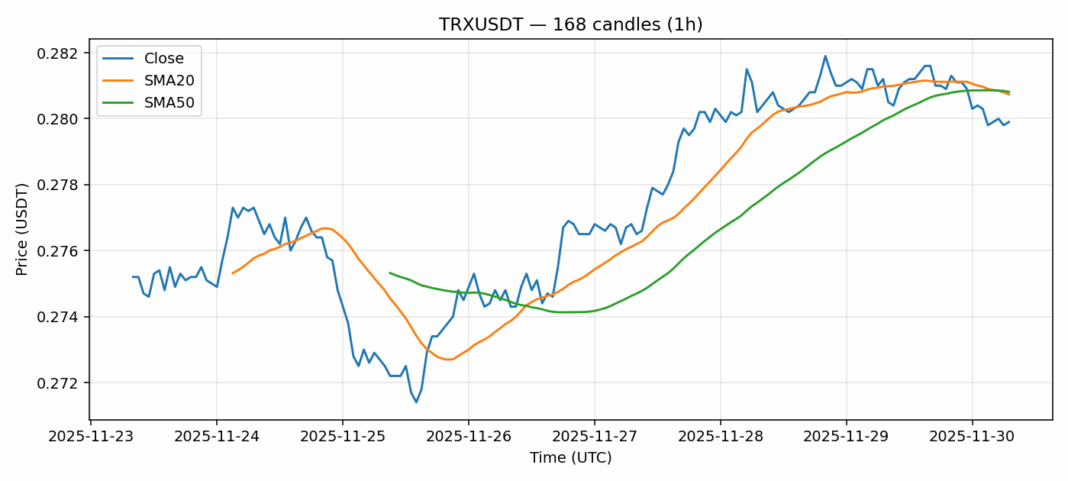 TRON — 1h candles, 7D window (SMA20/SMA50, RSI).