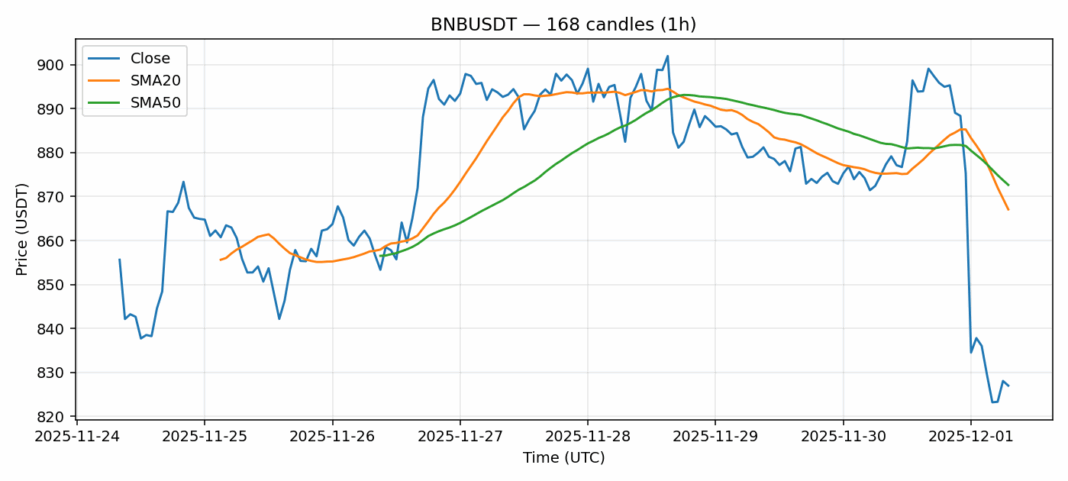 BNB — 1h candles, 7D window (SMA20/SMA50, RSI).