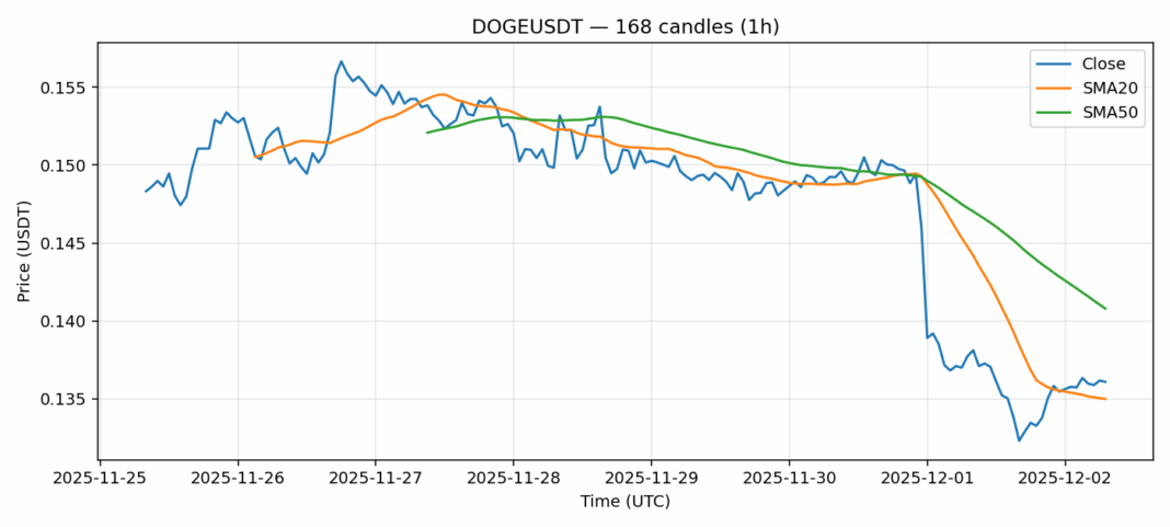 Dogecoin — 1h candles, 7D window (SMA20/SMA50, RSI).